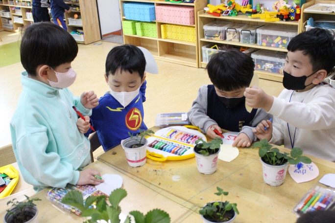 유아들은 각 반 교실에서 딸기 모종 관찰하기, 딸기송 노래 부르기, 클레이로 딸기 만들기, 딸기 정물화 그리기 등 딸기를 이용하여 다양한 자유놀이를 하였으며, 이를 통해 딸기에 관심을 갖고 관찰하며 딸기의 특징을 미술활동으로 표현해볼 수 있었다.