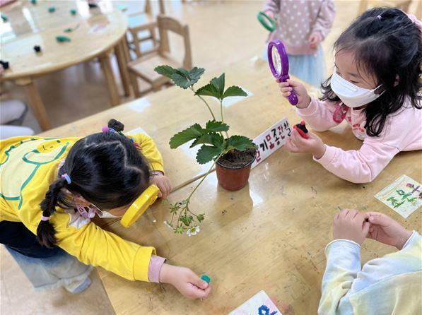 만 3세 00은 “점같이 콕콕콕 박혀있는게 딸기 씨에요.” 라고 말하며 관심을 보였고, 만 5세 00은 “딸기가 과일이 아니라 열매 채소래요!”, “딸기 모종은 처음 봐요. 여기서 딸기가 자란다는 게 너무 신기해요.”라며 딸기의 모양, 특징 등에 대해 알아보는 시간을 가졌다.
