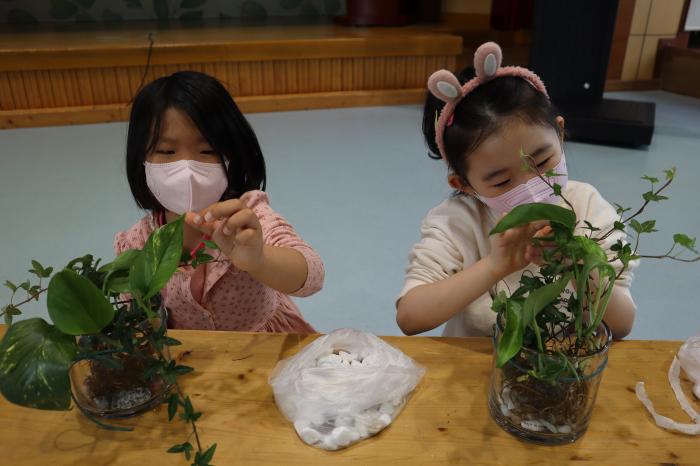 식목일 행사에 참여한 유아들은 아이비와 스킨답서스 식물에 대해 알아보고 나만의 수경식물 화분을 만들기 활동을 실시했다.