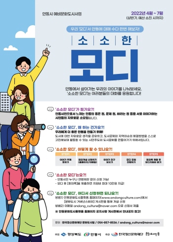 안동시 예비문화도시사업의 일환으로 추진 중인 시민들의 자유로운 소통 모임 <시민공회 ‘소소한 모디’>가 4월부터 7월까지 진행된다.