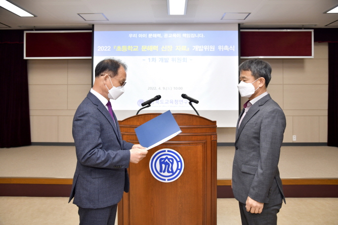경상북도교육청연구원은 4월 9일(토) 10:00에 교육연구관 301 회의실에서 25명의 개발위원을 대상으로 ‘2022년 초등학교 문해력 신장 자료 개발위원 위촉식’을 개최했다.