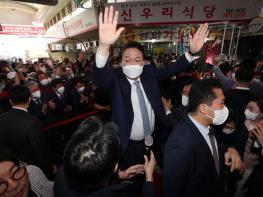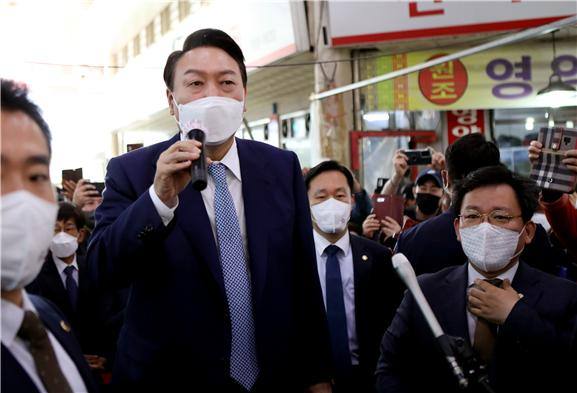 11일 경북 안동시 안동중앙신시장을 방문해 시민들에게 감사 인사를 드리고 있는 윤석열 대통령 당선인 사진/인수위기자단