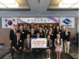 지난 9일 제34회 도쿄도민회 정기총회에서 회장으로 추대된 천병승 회장을 비롯한 참석한 회원들의 자발적인 참여로 성금 2000만원을 마련해 경북사회복지공동모금회에 전달했다.