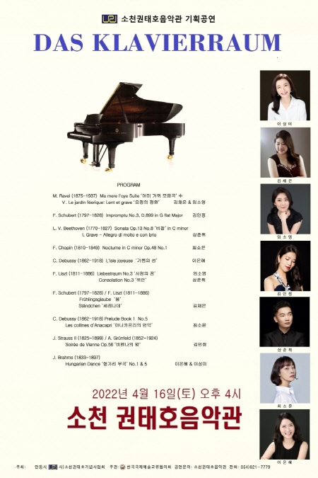 소천권태호음악관(관장 이필근)에서는 4월 16일(토) 오후 4시에‘피아노 콘서트 클라비어라움(Klavierraum)’공연을 개최한다.