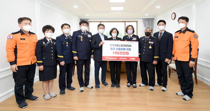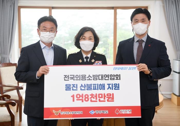 전국의용소방대연합회(도지사, 전국연합회장, 부회장 2, 사무총장, 도 연합회장 2, 공동모금회장, 소방본부장 등 총 9명)는 14일 대구경북광역행정기획단에서 울진산불관련 지원 성금1.8억원(총 모금액 3억 : 경북 1.8억, 강원 1.2억 )을 전달하며 격려했다.