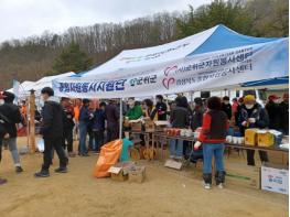 지난 10일 군위군 삼국유사면 화북리 인근 야산에서 발생한 산불 진화 현장 지원을 위해 자원봉사자들이 구슬땀을 흘렸다.