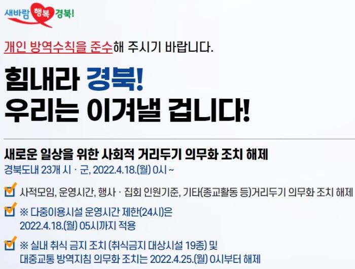 경상북도에서는 4월 18일(월) 23개 시·군(시 10, 군 13)에서 코로나19 확진자 국내감염 5831명, 국외감염 2명이 신규 발생했다.