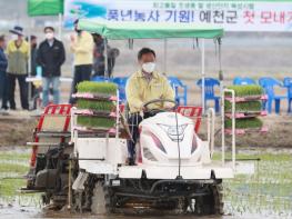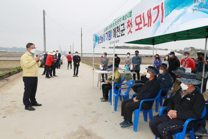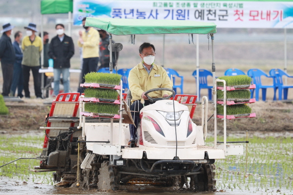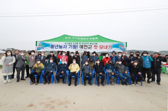 예천군은 21일 오전 9시 30분 조생종 벼(해담쌀) 작목반 회원들이 참석한 가운데 호명면 내신리 권형호씨 논에서 풍년 농사를 기원하는 첫 모내기를 했다.