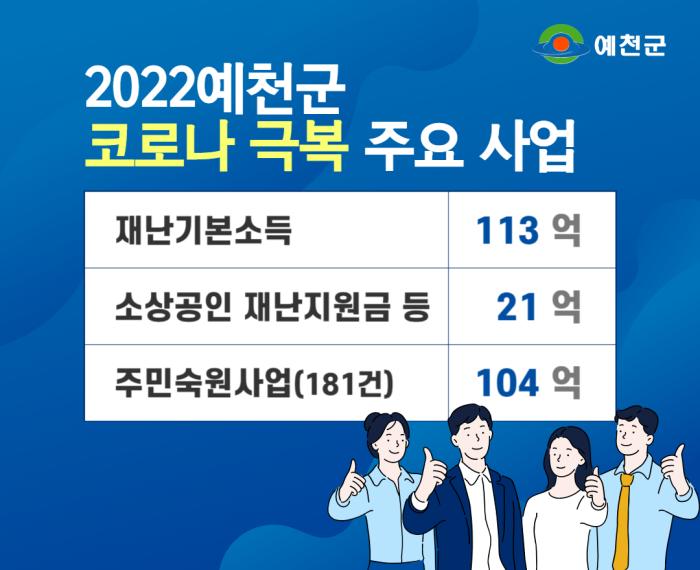 △군민 재난기본소득은 5~6월 중 신청 즉시 1인당 20만원씩 예천사랑상품권으로 지급하고, △소상공인 재난지원금은 4월중 접수를 받아 50만원씩 현금을 지원하는 한편, △173억원 규모의 예천사랑상품권을 5월부터 발행하여 지역 경기 활성화를 도모한다.
