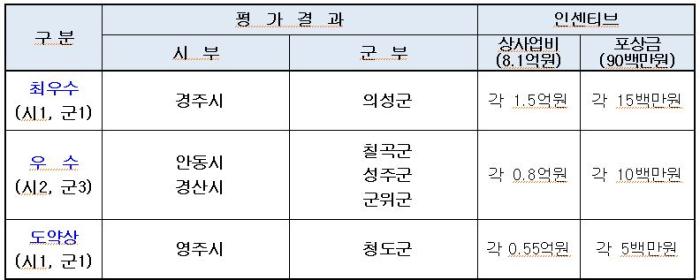 평가 결과 9개 우수 시군을 선정했으며, 최우수에는 경주시와 의성군, 우수에는 안동ㆍ경산시, 칠곡ㆍ성주ㆍ군위군이 선정됐다.