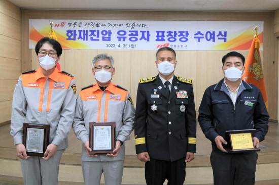 구담지역대 김주동 총무부장, 임천호 구조구급반장은 “화재로부터 우리 마을을 지키는 의용소방대원으로써 당연한 일을 한 것이다”며 “처음 화재를 발견 후 119신고와 화재진압에 힘써 준 주민 분들의 신속한 대처로 더욱 큰 피해를 막을 수 있었다”고 했다.
