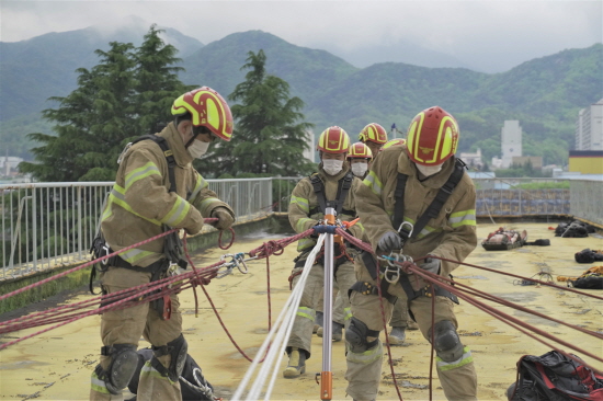 훈련은 붕괴사고 상황에서 ▷구조견과 장비를 활용한 인명 탐색 ▷착암기 등 파괴장비를 통한 장애물 제거 ▷목재 지주 제작 및 유압 지지대 설치 ▷로프시스템 설치를 통한 구조 대상자 이동 등 전문적 기법의 다양한 구조기술 역량 강화에 중점을 뒀다.