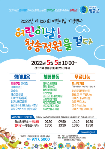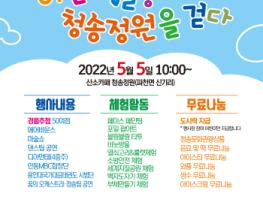 청송군은 오는 5월 5일 어린이날 100주년을 맞아 ‘산소카페 청송정원’(파천면 신기리 소재)에서 아이들이 체험할 수 있고 가족이 함께할 수 있는 ‘어린이날! 청송정원을 걷다’ 행사를 개최한다.
