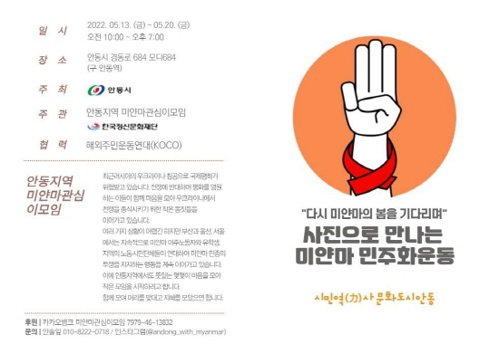 시민역(力)사문화도시 안동에서 '사진으로 만나는 미얀마 민주화 운동'이 5월 13일부터 20일까지 모디684(구. 안동역) 갤러리에서 열린다.