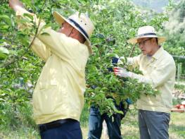 이날 장 시장은 부석면 임곡리 사과농가를 방문해 농업기술센터와 부석면 직원 40여 명과 함께 사과적과 작업을 실시하고 지역 과수농가의 애로사항을 청취했다.