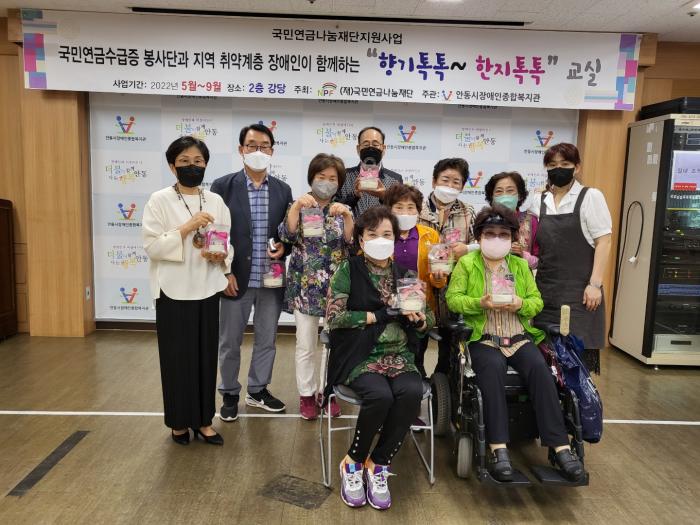 국민연금나눔재단이 주최하고 안동시장애인종합복지관이 주관하는 국민연금 수급자 봉사단과 함께하는 향기톡톡 & 한지톡톡 교실은 국민연금 수혜자인 수급자 모임 회원과 지역 취약계층 성인장애인이 함께 참여한다.