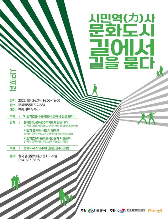 한편, 제2회 시민포럼은 원주시와 김해시를 초대하여 6월 중에 진행할 예정이며, 사전 참여 문의는 한국정신문화재단 문화도시팀 054-857-8535으로 하면 된다.
