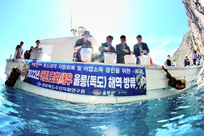 경상북도 수산자원연구원은 수산자원의 회복과 어업인 소득 증대를 위해 동해 황금어장인 울릉 및 울진 왕돌초 해역에 도화새우 30만 마리를 방류했다.
