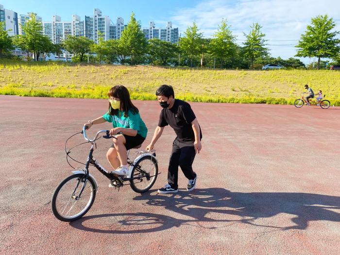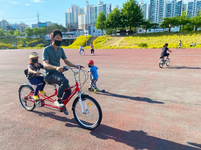 처음으로 두발 자전거를 탄 아이가 혹여나 넘어질까 아버지는 뒤에서 자전거를 붙잡고 뛰어 간다. 더 작은 아이들은 뒤쪽 안장에 않아 아버지 허리춤을 잡고 광장 한 바퀴를 돌아본다.