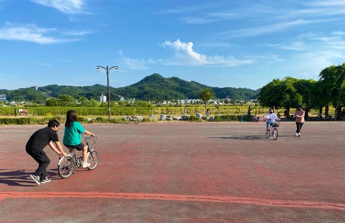 [화보] 금계국이 황금빛 물결을 이룬 안동 낙동강변 둔치에서 가족 나들이에 나선 시민들이 자전거를 타며 즐거운 오후를 보내고 있다.