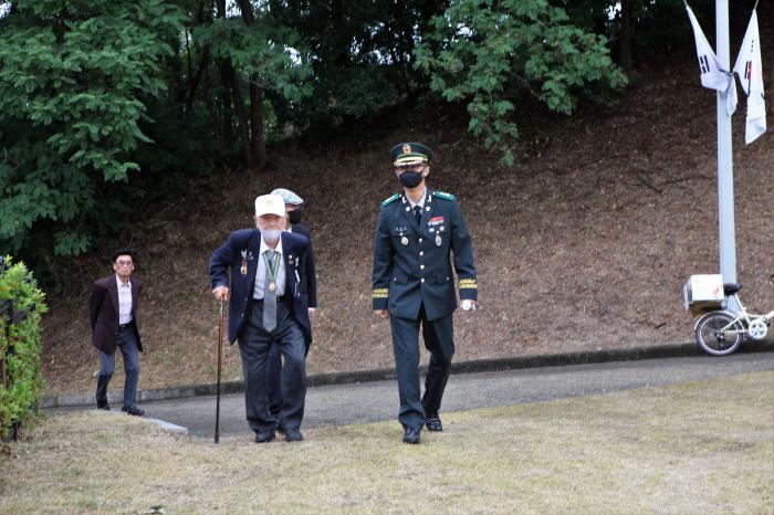 불굴의 의지로 국가를 수호하기 위해 헌신한 노병과 그 선배의 애국 애족의 충정을 잇겠다는 결의 넘치는 후배 병사의 모습으로 여겨 집니다만 실은 이사진의 오른쪽 장교는 안동시 충혼탑 입구에서 부터 걸어 올라오는 모습을 우연히 목격하게 되었습니다.