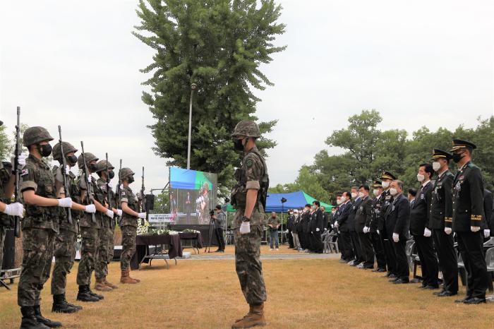 그때 이 장교는 주차장에서 언덕으로 오르는 나이 많으신 유가족으로 보이는 할머니를 부축해 계단을 오른 뒤 추념식장에 입장하는 중이었지요.