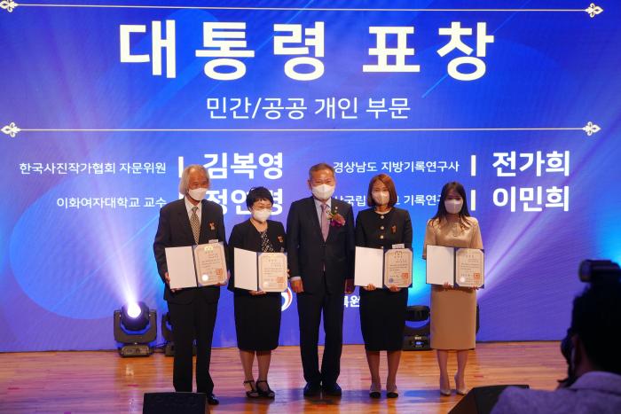 ▲6월 9일 경기도 성남 국가기록원 나라기록관에서 열린 ‘2022년 기록의 날’ 기념식에서 대통령 표창을 수상한 향토사 기록가 김복영(왼쪽 첫 번째) 선생, 중간은 이상민 행정안전부장관