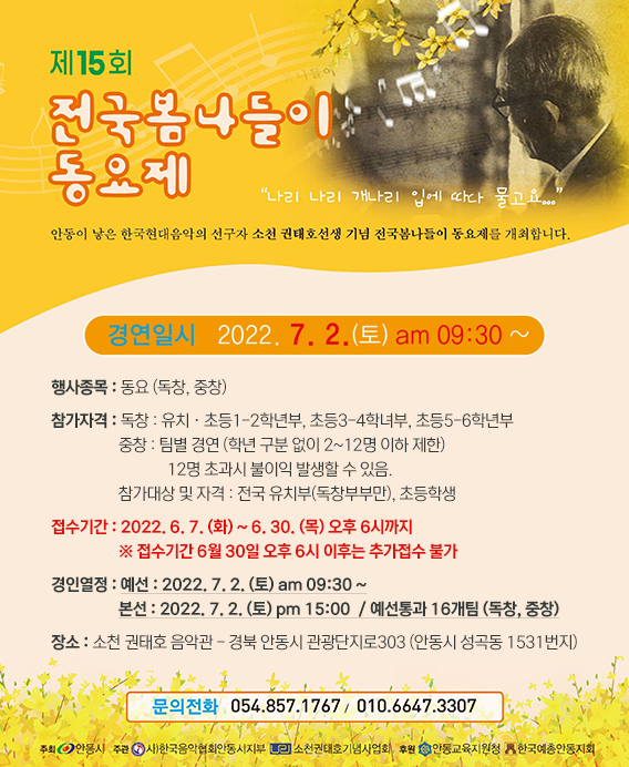 안동시가 주최하고 (사)한국음악협회안동지부에서 주관하는 ‘제15회 전국 봄나들이 동요제’가 오늘 7월 2일(토) 15시에 소천 권태호 음악관에서 열린다.