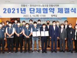 안동시(시장 권영세)와 전국공무원노동조합 안동시지부(지부장 유철환)는 6월 16일 권영세 안동시장, 유철환 전국공무원노동조합 안동시지부장 등 노・사 양측 교섭위원 18명이 참석한 가운데 ‘노・사 단체협약’을 체결했다.