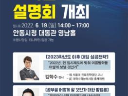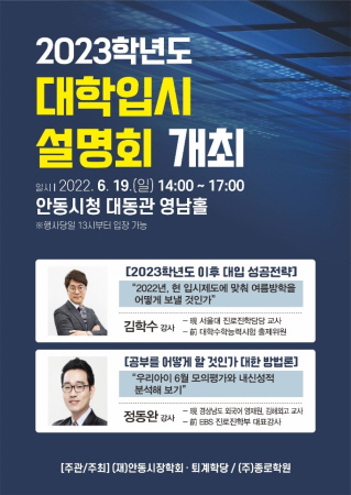 안동시장학회와 퇴계학당이 주최하고 ㈜종로학원이 주관하는 『2023학년도 대학입시 설명회』가 오는 6월 19일 시청 대동관 영남홀에서 500여 명의 학생·학부모가 참석한 가운데 개최된다.