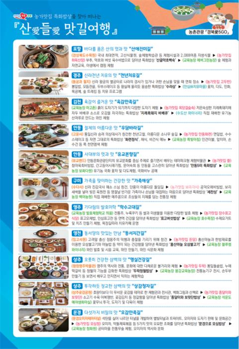 산愛들愛 맛길여행이란 농업기술원에서 ‘경북愛5GO’프로젝트 일환으로 개발한 테마별 코스로 농가맛집, 농촌교육농장, 농촌관광자원을 상호 연계해 특색 있는 농촌여행을 할 수 있는 프로그램이다.