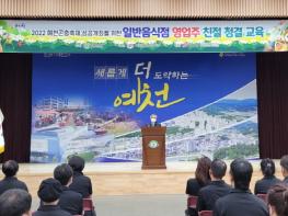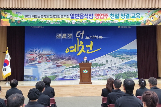 한국외식업중앙회 예천군지부(지부장 장인동) 주관으로 진행된 이번 교육은 SEMI 곤충엑스로 2022 예천곤충축제 및 각종행사 대비 △ 영업주 친절의식·고객응대 요령 △출입구, 카운터 등 영업장 정리 정돈 △코로나19 예방을 위한 마스크 착용 등 방역수칙을 안내하고 미소․친절․청결 예천사랑 운동도 병행했다.