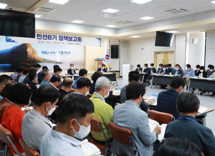 영양군(군수 오도창)은 7월 28일 군청 대회의실에서 오도창 군수를 비롯해 부군수, 국실과소장 및 팀장 전원이 참석한 가운데 ‘민선8기 정책보고회’를 개최했다.