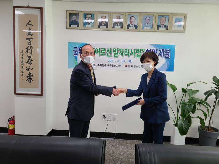 (군위군=경북온뉴스) 김승진 기자 = 한국수자원공사 군위댐지사는 3월 25일(목) 대한노인회 군위군지회에서 군위댐주변지역 어르신 일자리사업 추진을 위한 위수탁 협약을 체결했다.