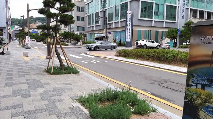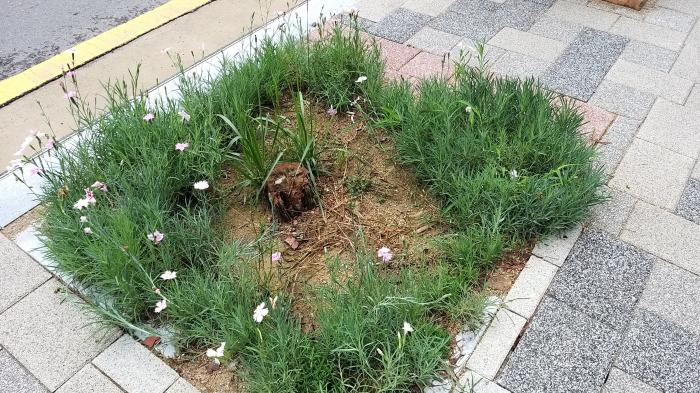 예쁜 꽃밭(정원)이구나 하시겠지만 안동시가(권영세 시장 재임시) 시민들의 반대에도 불구하고 기어히 밀어부친 영가로(웅부공원에서 구 안동역에 이르는 시가지 도로) 보행자 우선 도로 환경정비 사업 중 인도에 소나무를 식재(이식)했던 곳인데 불과 2달여 만에 어쩐일인지 소나무(3그루)는 잘려져 나갔고 흉물(?)로 방치되고 있어 안동시의 사업 성과에 대한 철저한 조사와 예산낭비에 따른 책임규명은 물론 추후 정비 계획을 시민들에게 알려야 하지 않을까 싶다.