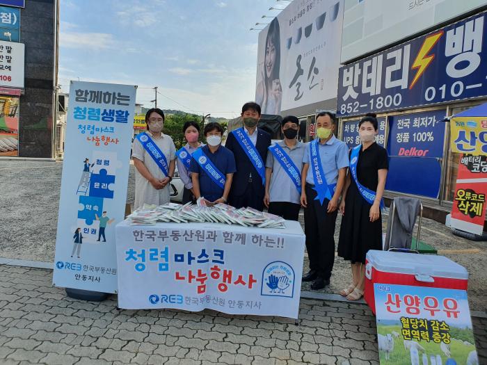 한국부동산원 안동지사(지사장 김기현·이하 안동지사)는 8월 17일 지사 인근 거리와 주변상가 등에서 이웃과 함께하는 청렴마스크 배포 행사를 실시했다.