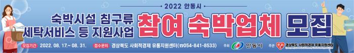 안동시는 『2022 숙박시설 침구류 세탁서비스 등 지원 사업』에 참여할 숙박업체를 오는 8월 17일부터 31일까지 모집한다.