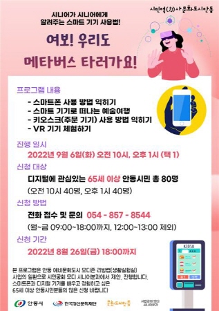 시민역(力)사 문화도시 안동에서는 문화도시 리빙랩 사업의 하나로 시민공회 시니어분과(분과장 김동남)에서 실행하는 <여보! 우리도 메타버스 타러가요!> 프로젝트를 9월 6일 오전 10시와 오후 1시 두 차례에 걸쳐 진행한다. 행사 참여자는 오는 8월 26일(금)까지 모집할 예정이다.