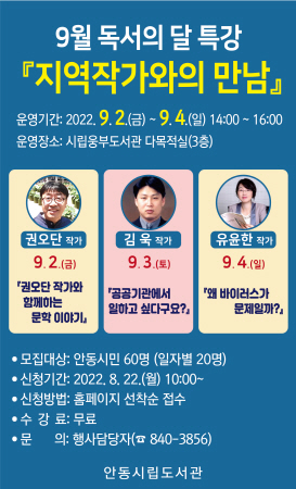 안동시립도서관은 9월 2일부터 4일까지 사흘간 오후 2시에 웅부도서관(3층 다목적홀)에서 지역작가 특강을 개최한다.