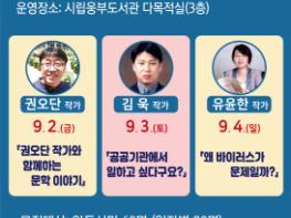 ▲ 9월 2일(금)은 동화작가인 권오단 작가를 초청해 「권오단 작가와 함께하는 문학 이야기」를 ▲ 9월 3일(토)은 최근 책을 낸 김 욱 작가의「공공기관에서 일하고 싶다구요?(부제: 공공기관 취업 성공을 위한 마스터플랜)」라는 주제로 ▲ 9월 4일(일)은 과학 분야 전문인 유윤한 작가의「왜 바이러스가 문제일까?」라는 주제로 진행한다.