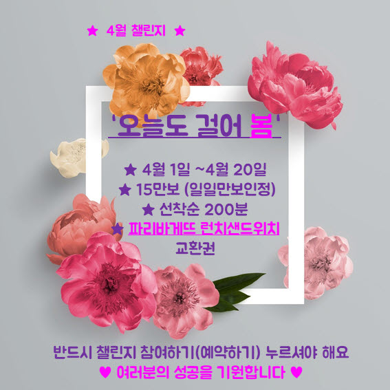만 19세 이상 본인명의의 휴대폰 소지자인 안동시민은 누구나 4월 챌린지 이벤트에 참여할 수 있다. 참여방법은 스마트폰의 ‘PLAY스토어’또는 ‘앱스토어’에서 ‘워크온’을 검색해 설치하고 안동시 마카다 걷기 공식 커뮤니티에 참여하면 된다.