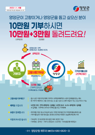 오도창 영양군수는 “출향민과 주민들에게 고향사랑기부제의 시행취지를 알리고, 적극적인 관심과 참여를 유도하기 위한 홍보에 최선을 다해달라”라고 당부했다.