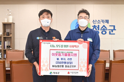 NH농협농협은행 청송군지부는 매년 지역 내 저소득층과 소외계층을 위한 기부와 인재육성 장학금기부, 자원봉사 등 사회공헌활동을 꾸준하게 전개하고 있다. 이번에 기부한 물품은 쌀, 휴지, 라면 등 250만원 상당이며, 경상북도사회복지공동모금회를 통해 어렵게 살아가는 이웃들에게 전달될 예정이다.