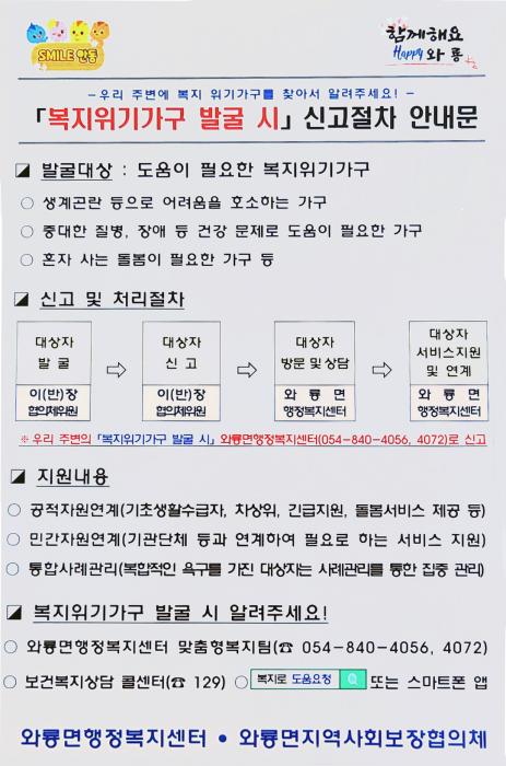 (안동시=경북온뉴스) 김광열 기자 = 안동시 와룡면 지역사회보장협의체(위원장 권기식)와 맞춤형복지팀은 4월 1일(목)부터 2개월간「찾아가는 보건복지서비스 강화」를 위해 “복지안전망 구성원 확대”와 “저소득 중장년층(40세~64세) 발굴”에 적극 노력할 방침이다.
