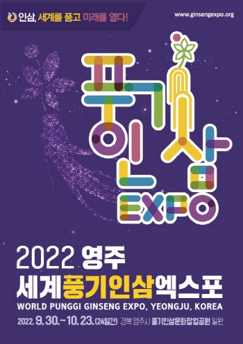 오는 9월 30일부터 10월 23일까지 24일간 영주시 풍기인삼문화팝업공원 일원에서 ‘인삼, 세계를 품고 미래를 열다’라는 주제로 2022영주세계풍기인삼엑스포가 개최된다.