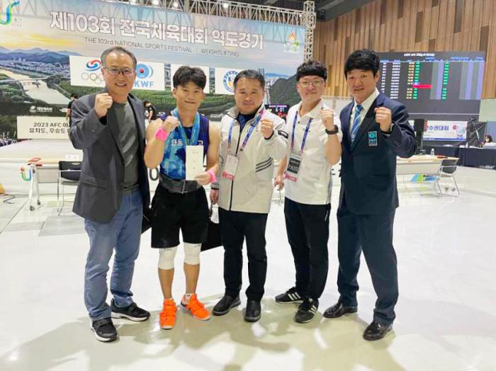 ▼사진왼쪽부터 김동필 경북연도연맹전무, 김두현 경북역도연맹 회장, 김재현 중앙고체육교사, 남지용 선수, 이규철 경덕중 코치, 김재민 중앙고 코치