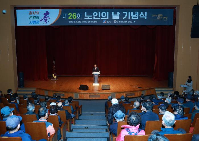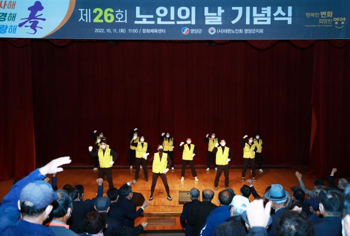 올해 기념행사는 3년 만에 대면행사로 진행됐으며, 제26회 노인의 날(10월 2일)을 맞아 노인공경의 의미를 더 깊이 이해하고 기념하고자 마련한 행사다. 기념식에 앞서 식전행사는 금빛히어로즈 합기도 시범단과 영양 바람소리 색소폰 동호회의 재능기부 공연으로 시작됐다.