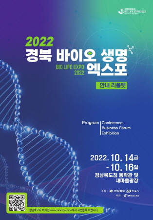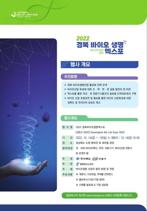 안동시와 경상북도는 10월 14일부터 16일까지 사흘간 경북도청 동락관 및 새마을광장에서『2022 경북 바이오‧생명 엑스포』를 개최한다.