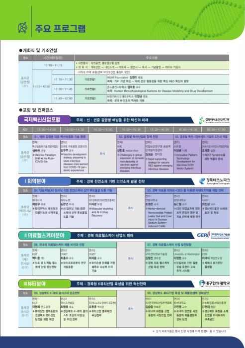 의약분야에서는 '경북 천연소재 기반 의약소재 발굴 전략'을 주제로, 의료·헬스케어분야는 '경북 헬스케어 산업의 미래'를 주제로, 뷰티분야에서는 '경북형 K뷰티산업 육성을 위한 혁신전략'을 주제로 토론이 진행된다.