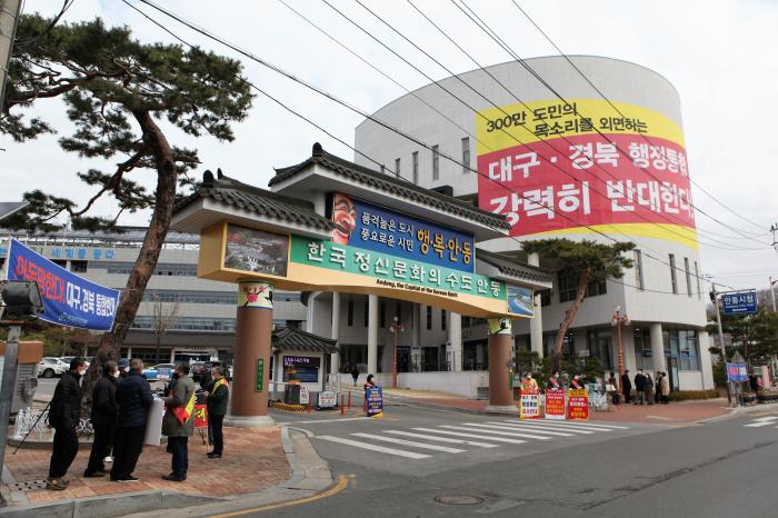(안동시의회=경북온뉴스) 김승진 기자 = 대구경북 행정통합 추진 반대 안동지역 범시민연대(15개 단체)(63명)와 안동시의원(18명), 경북도의원(5명) 등은 2021. 4. 1.(목) 07:30~08:30.까지 경북도청 동문, 서문에서 '대구경북 행정통합 추진 반대' 시위 및 성명서 발표를 예고했다.